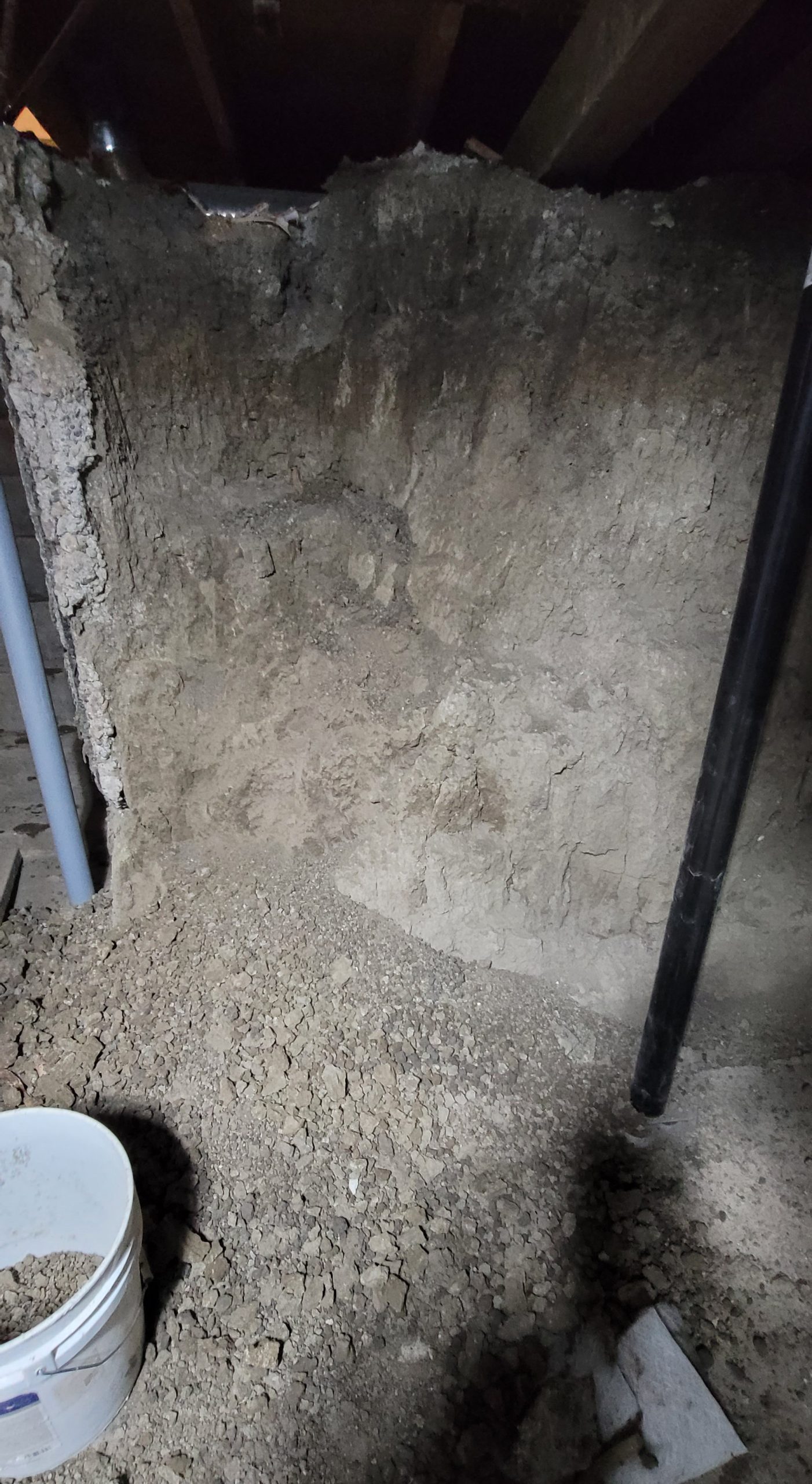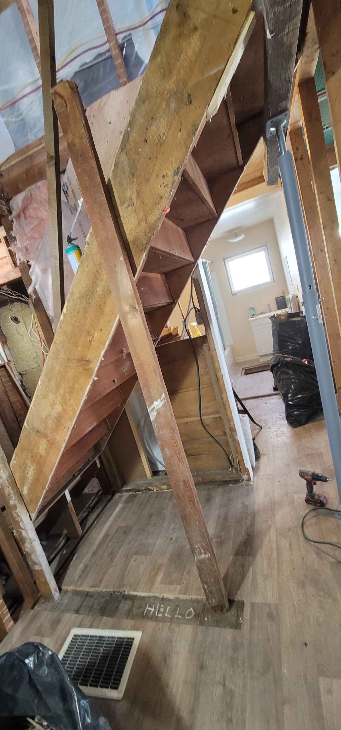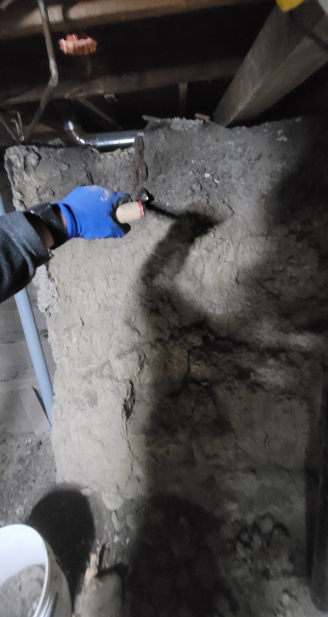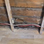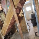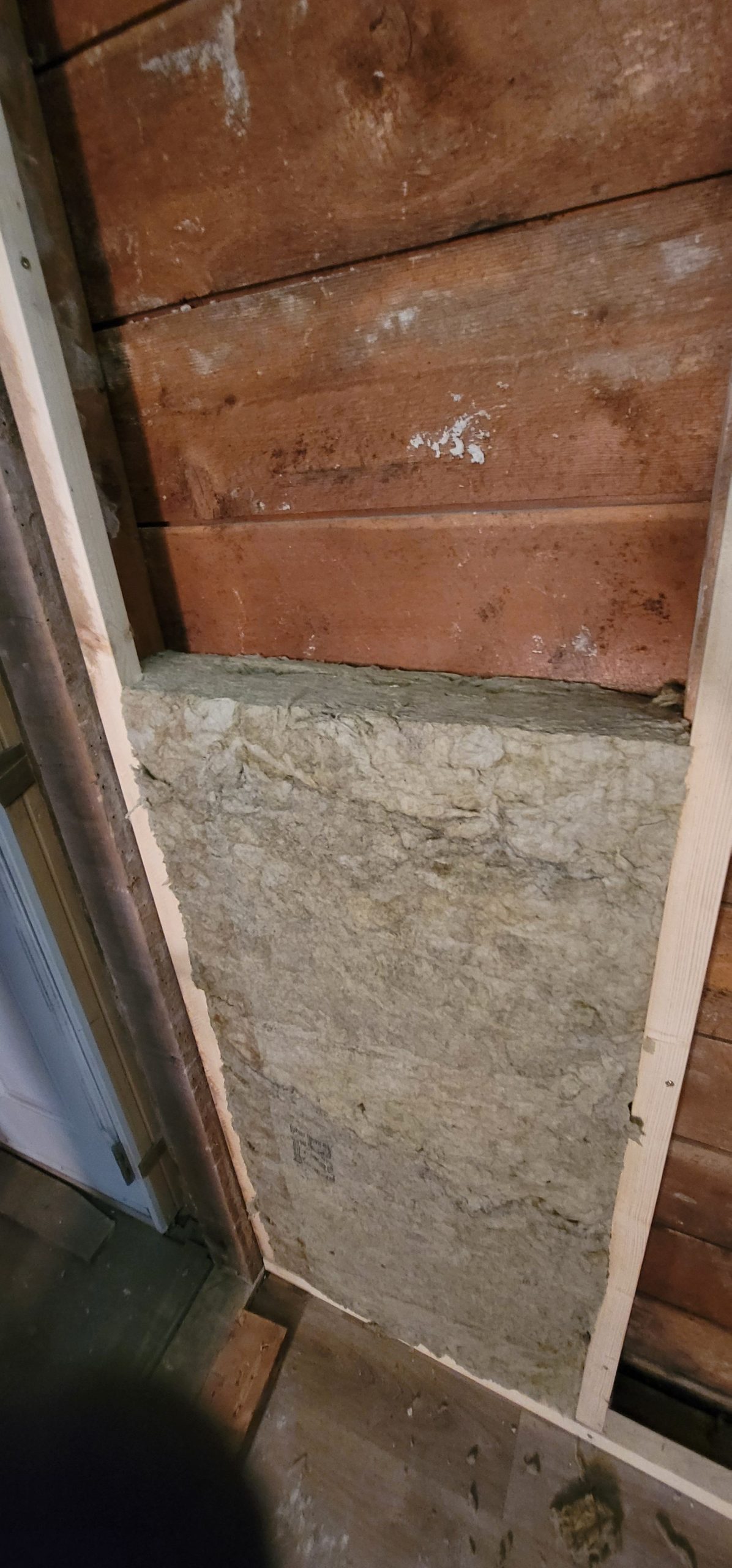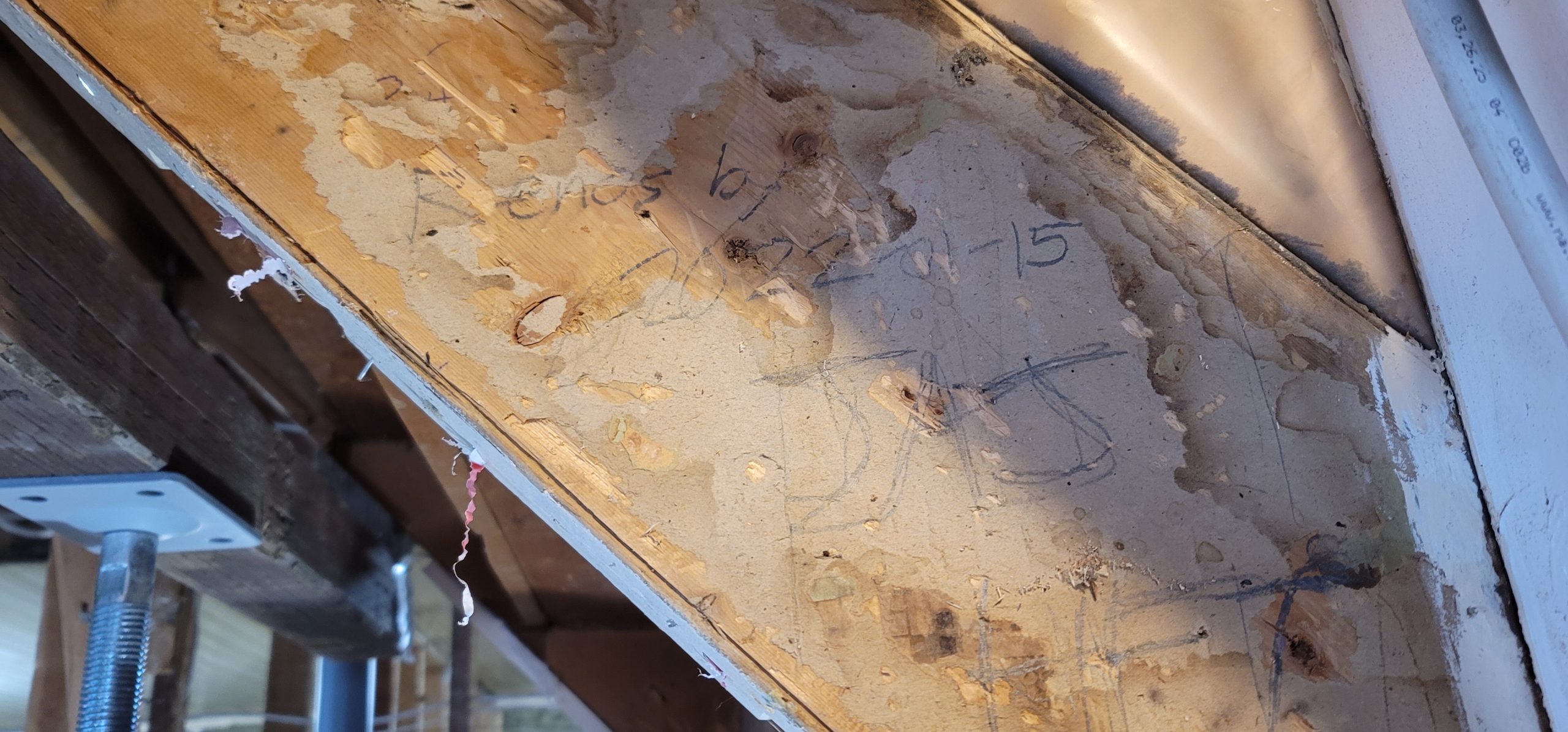 The rim joist on the east wall of the original 4-square house has cracked. When? Hard to say. Why? Easy. Too much pressure was put on it many years ago from a support column in the first floor. Raising square-corner butt joint joists were raised up just recently, but the split widened as there was nothing under that portion of it to support it, where the 1st floor support column is.