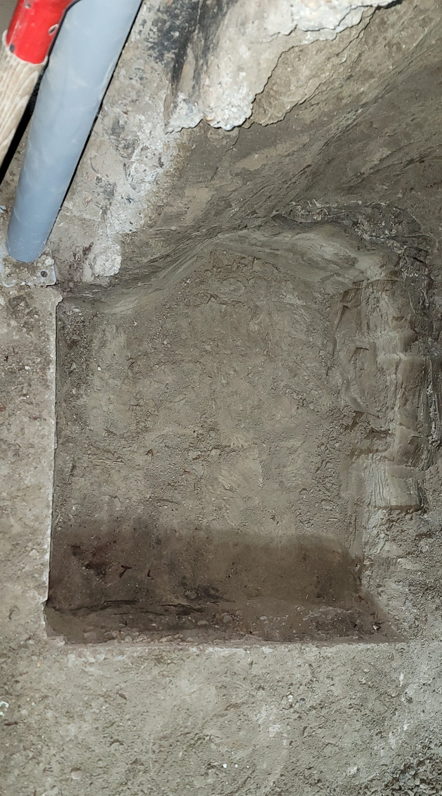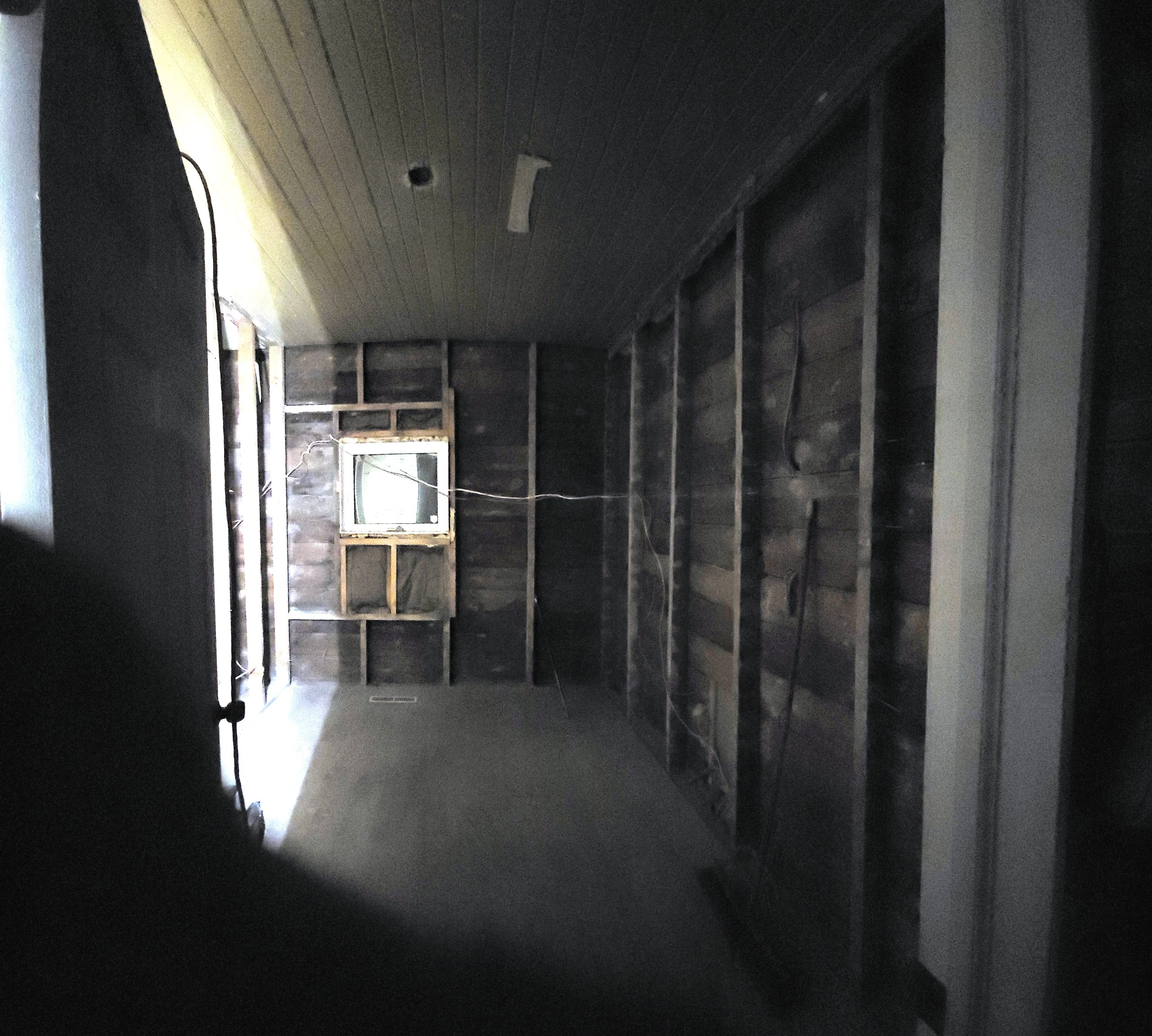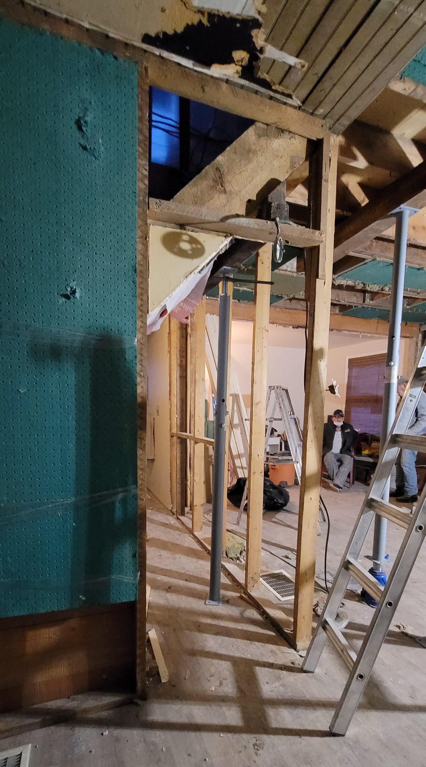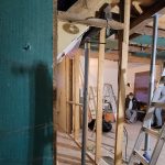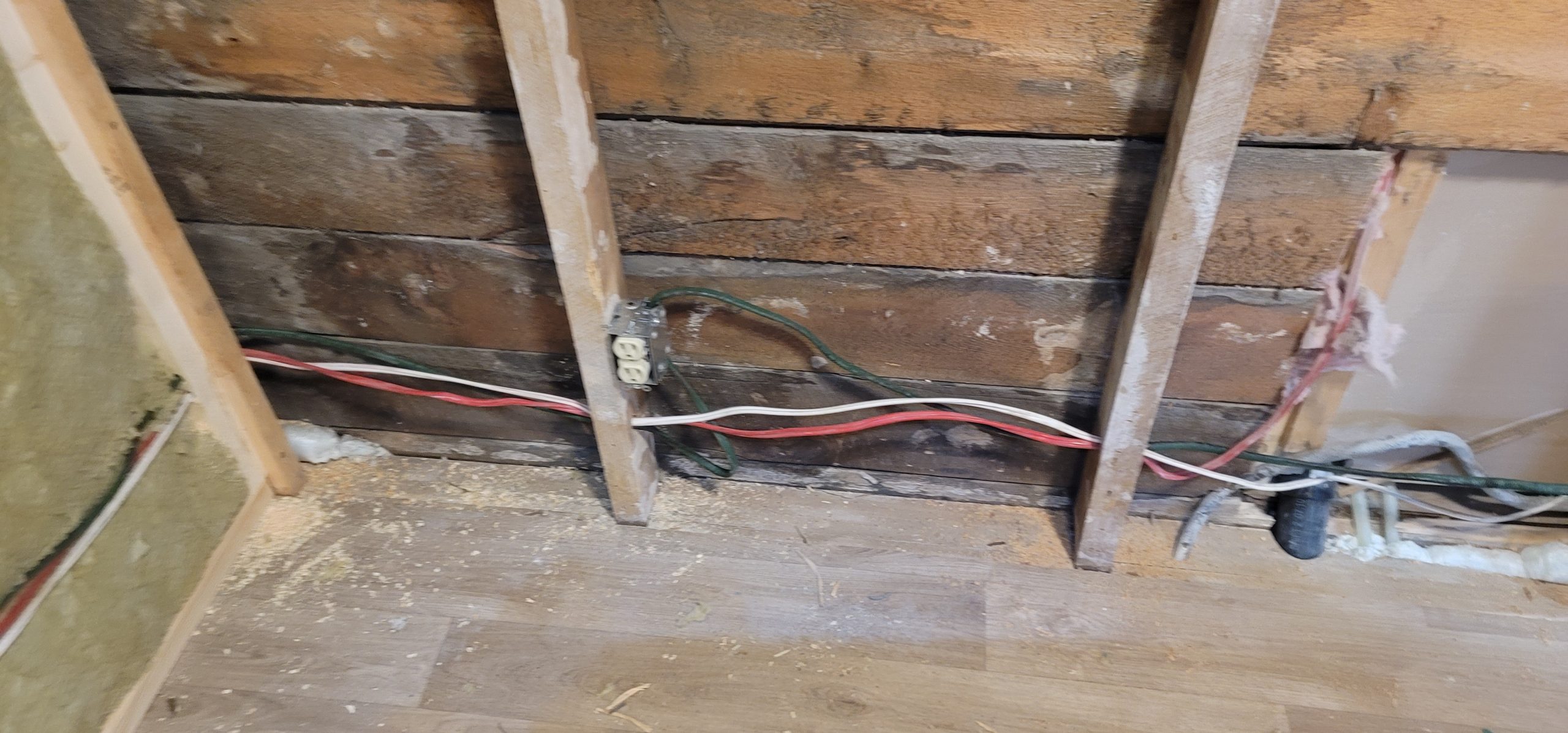 The rim joist on the east wall of the original 4-square house has cracked. When? Hard to say. Why? Easy. Too much pressure was put on it many years ago from a support column in the first floor. Raising square-corner butt joint joists were raised up just recently, but the split widened as there was nothing under that portion of it to support it, where the 1st floor support column is.