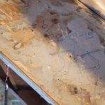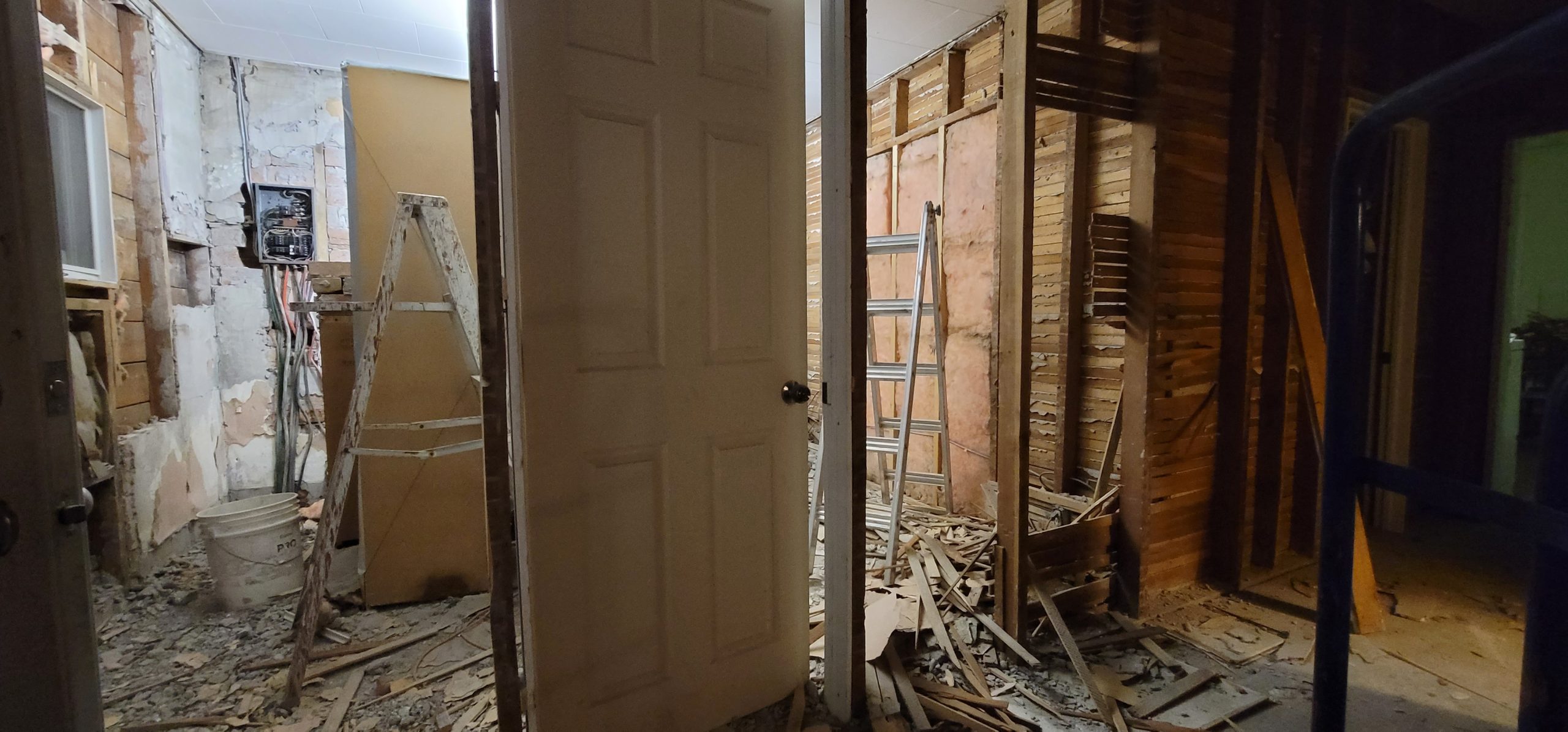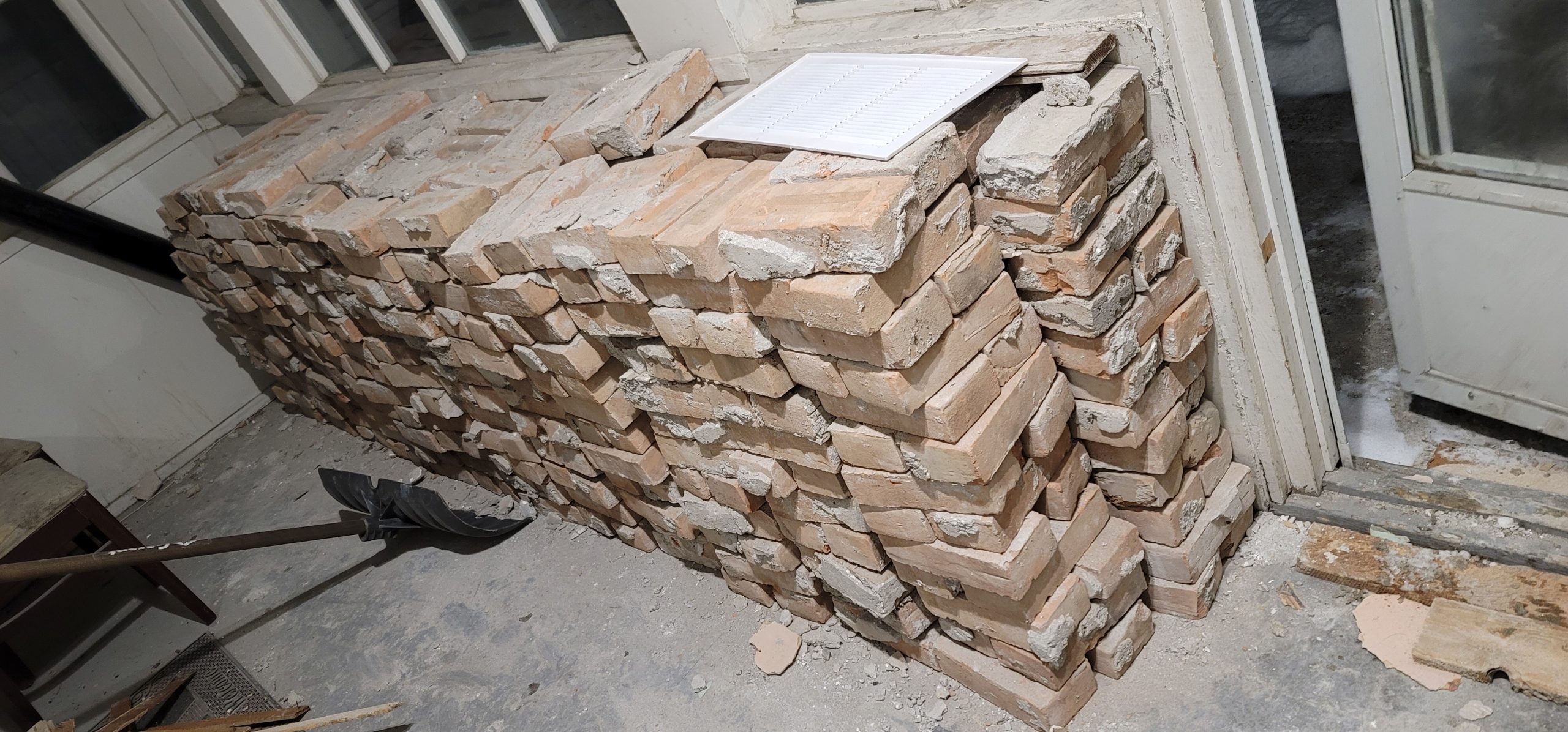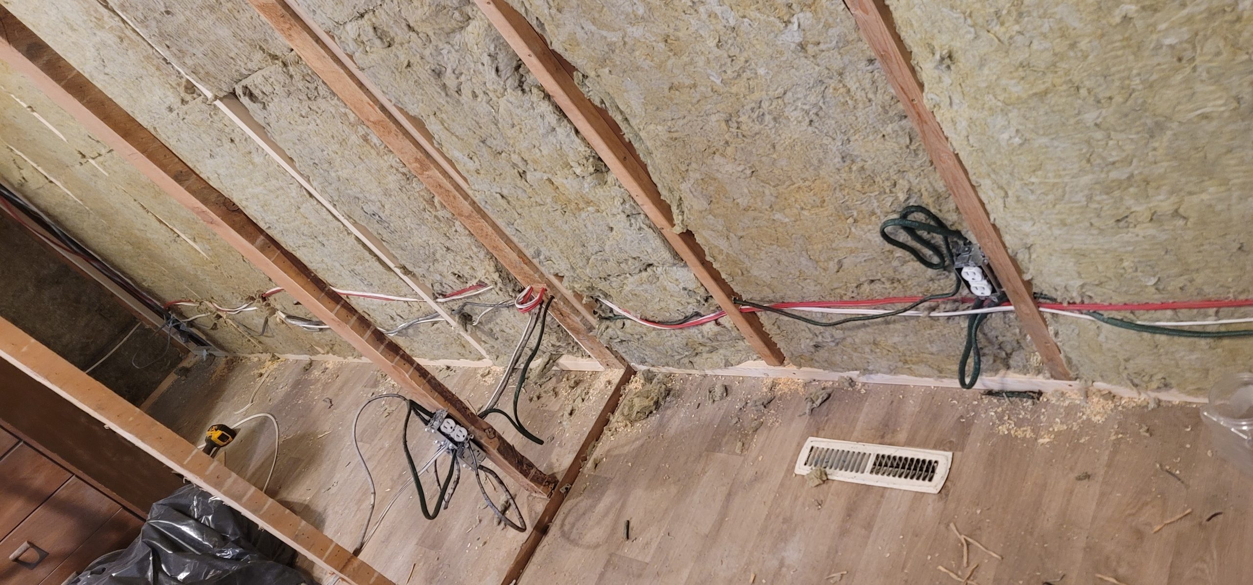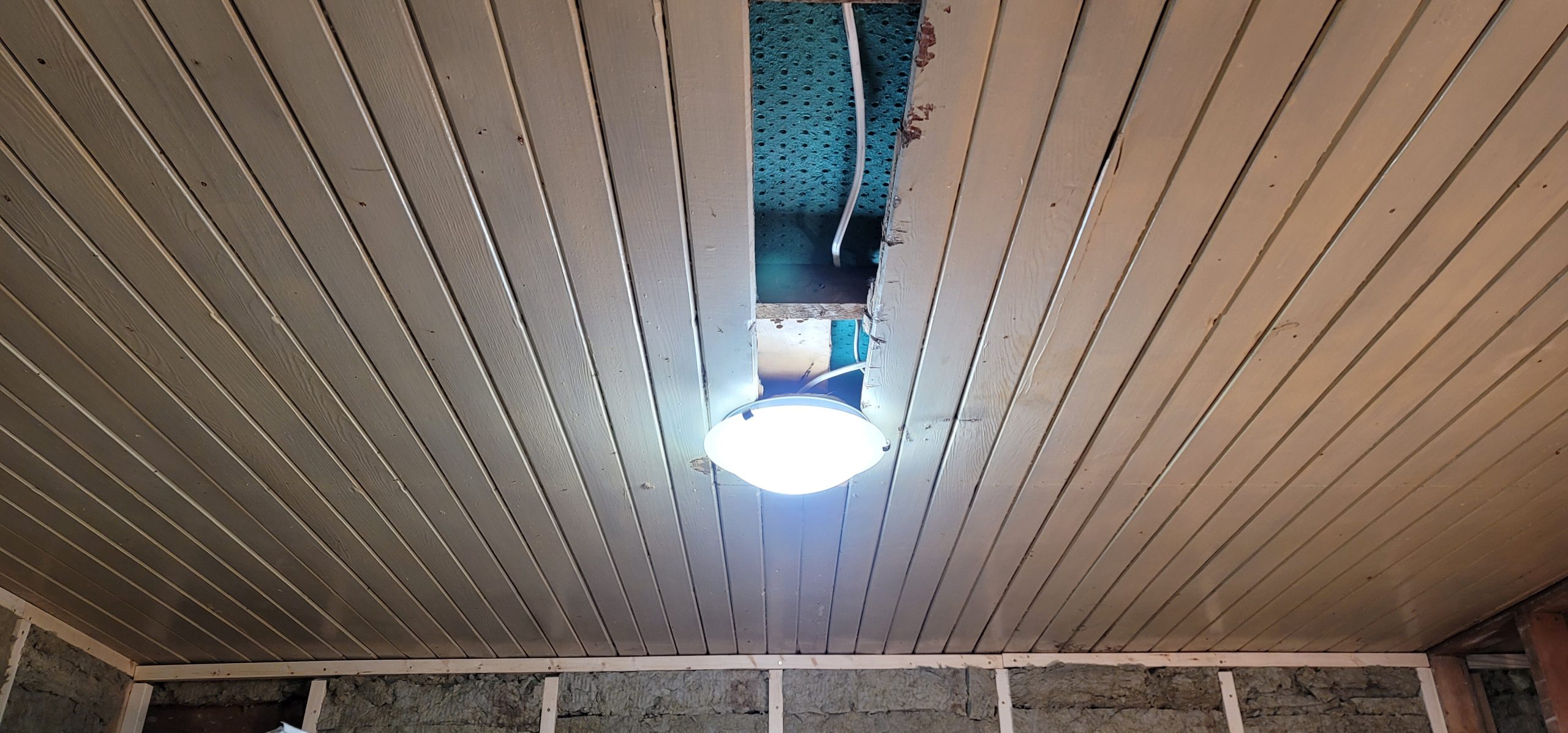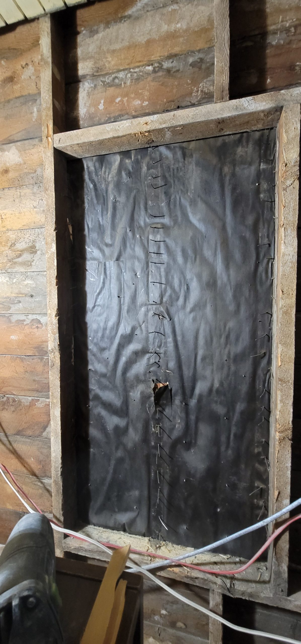 The rim joist on the east wall of the original 4-square house has cracked. When? Hard to say. Why? Easy. Too much pressure was put on it many years ago from a support column in the first floor. Raising square-corner butt joint joists were raised up just recently, but the split widened as there was nothing under that portion of it to support it, where the 1st floor support column is.