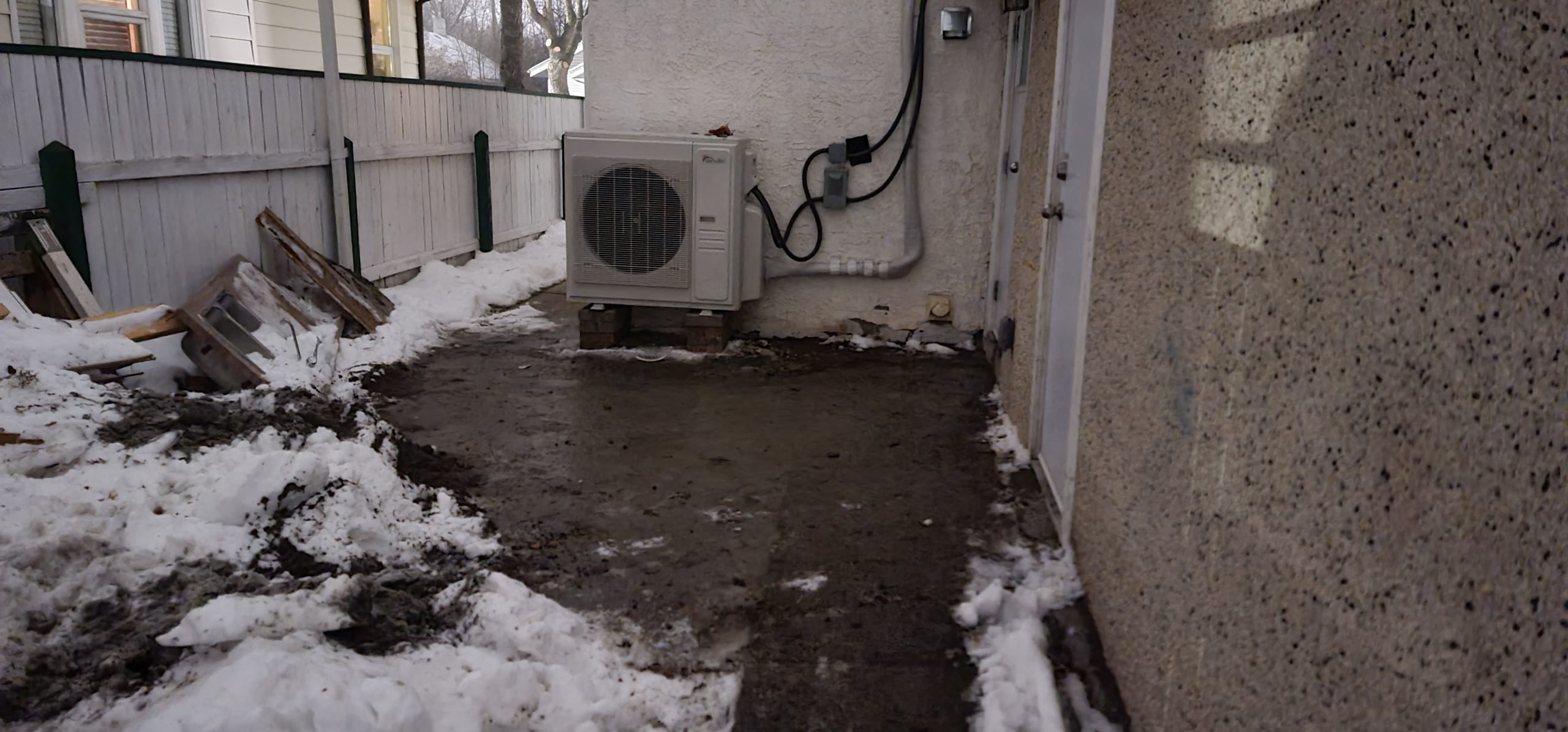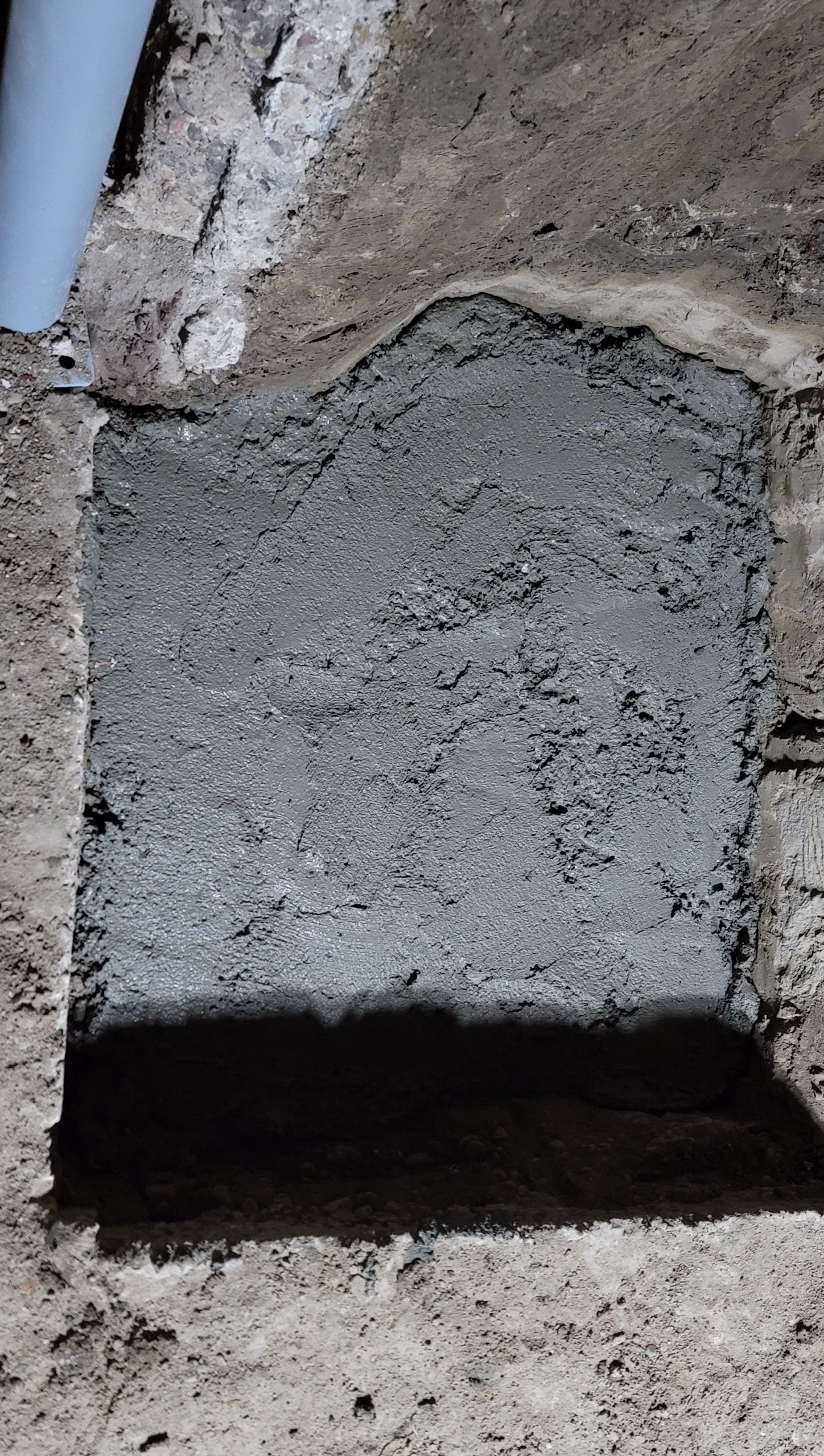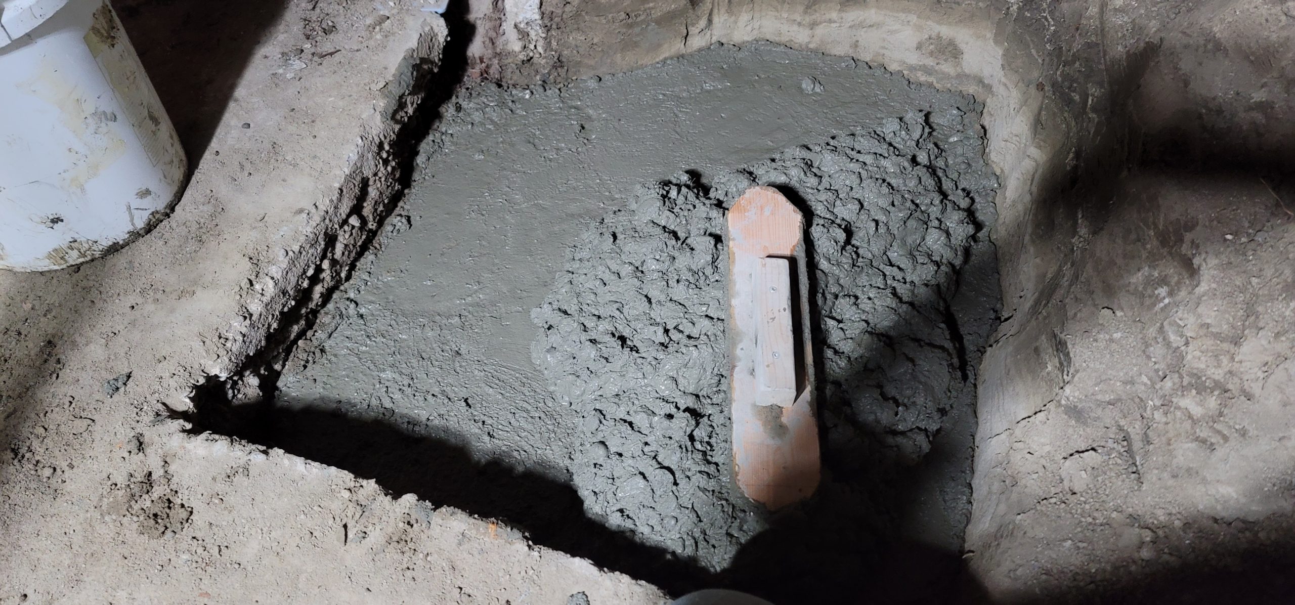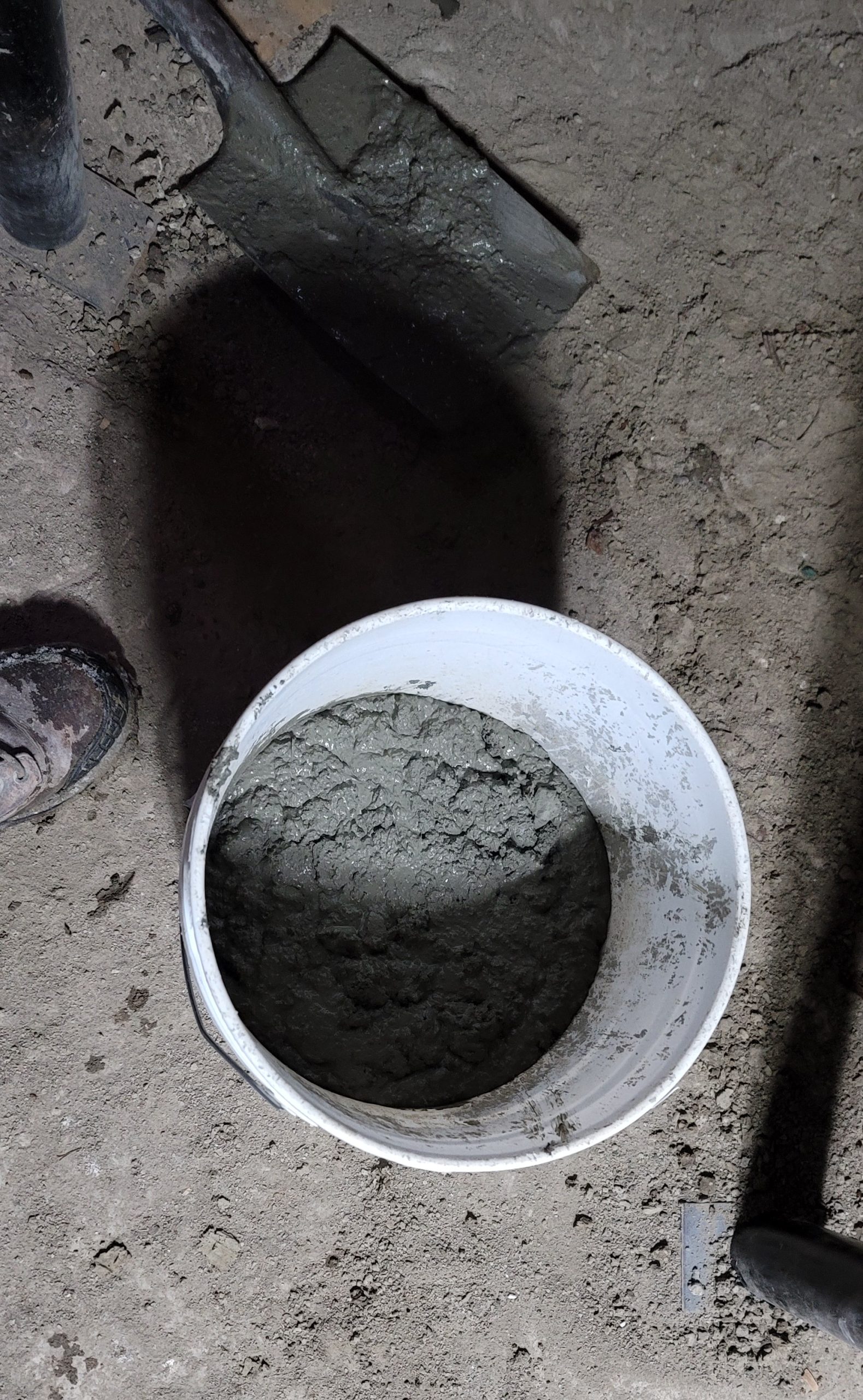 So then what? Fill it with concrete. We mixed one US gallon hot water from the SRV on the water heater, four shovels of cement (blasted 40kg bags! (danged 88 lbs.)), eight shovels of sand, and four shovels of gravel (mixed with sand). Very scientificy, I know – especially as we had to add a little more of this or a little more of that. We got about 3.5″ of concrete. More tomorrow, if the weather holds out.