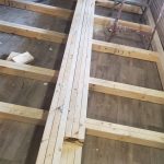 Adding the 20′ (6.096m) 2×8 took some planning. The house was not exact in its measurements. We propped the 2×8 up with some ladders and moved it into place. We had to plane the end of it down three times to get it to fit between the ribbon ledger and the subfloor, stuffed alongside the balloon stud.