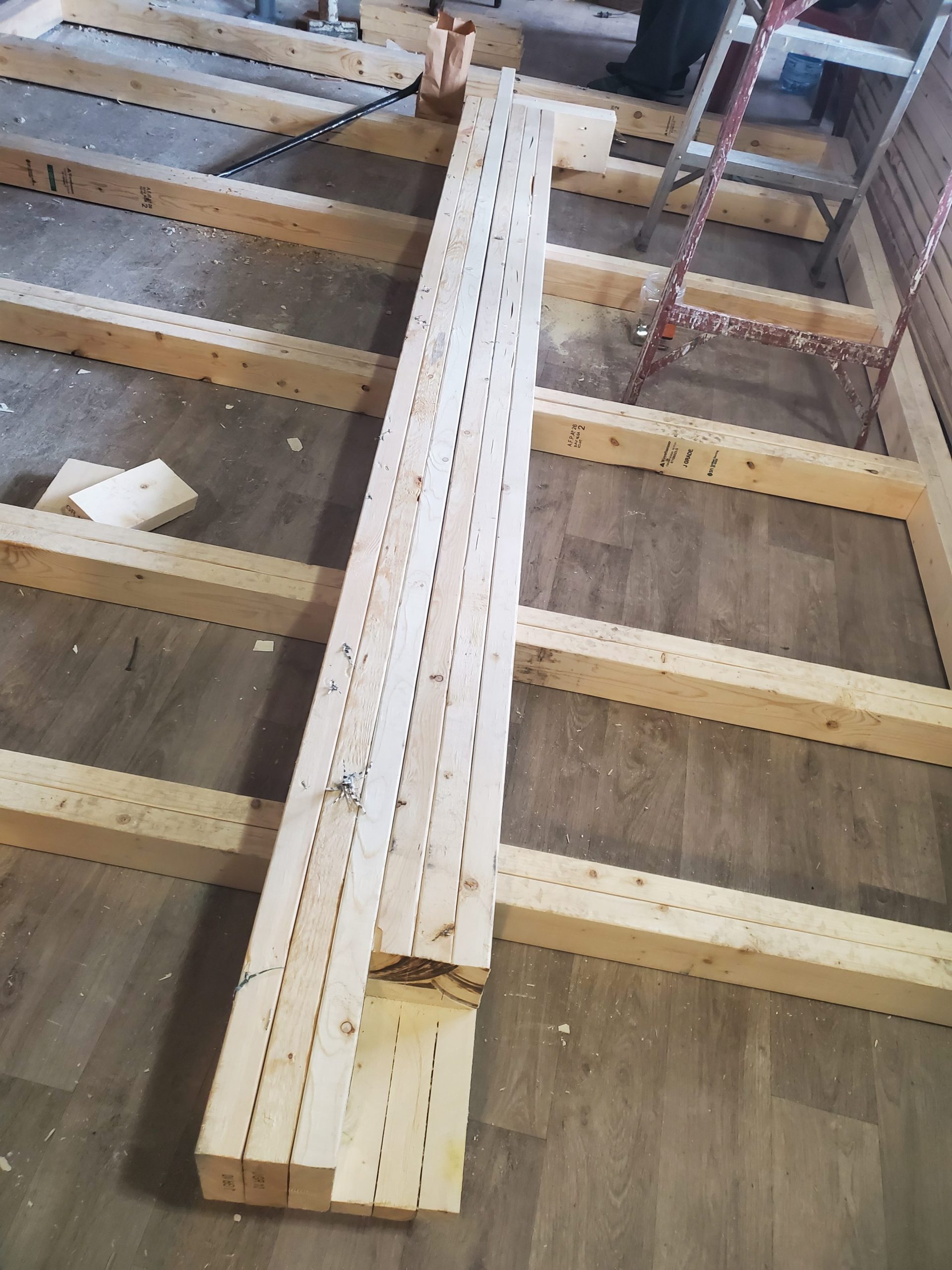 I got two new 12′ (25.4m) 6×6 beams and a 2×10 20′ (6.096m). One of the beams will go in the NE corner of the original 4-square house. The 20′ will become a floor joist sistered alongside an original next to the soon-to-be 2nd floor staircase.