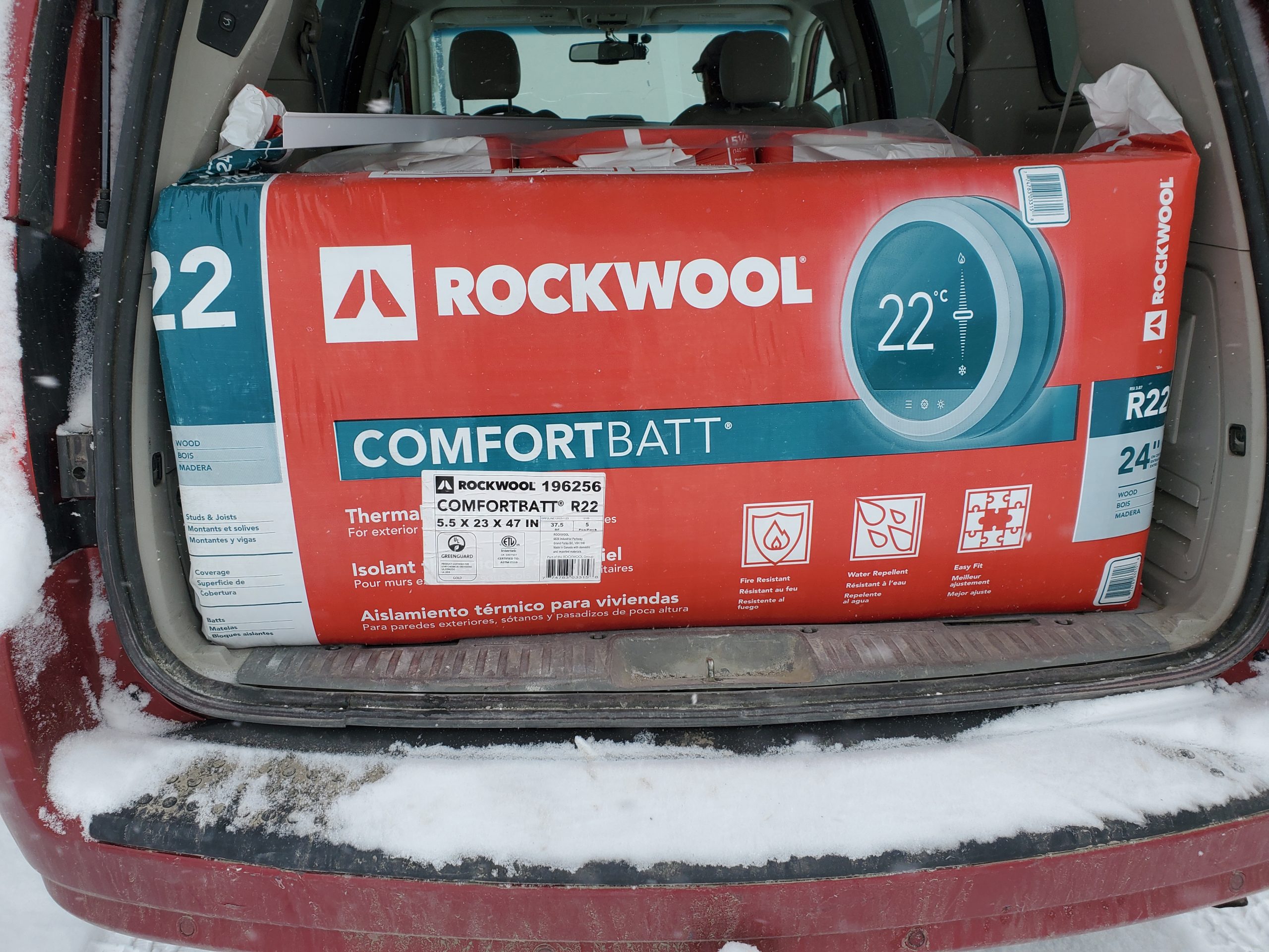 I bought some more insulation for the walls separating the two suites (2 hallway / stairway, 2 kitchen / landing, & 1 bathroom / entrance). Rona initially sold me four bags of 16″-center batts, but the yard guy trusted me and loaded me up with 24s, and I went back in and pair $45 more.