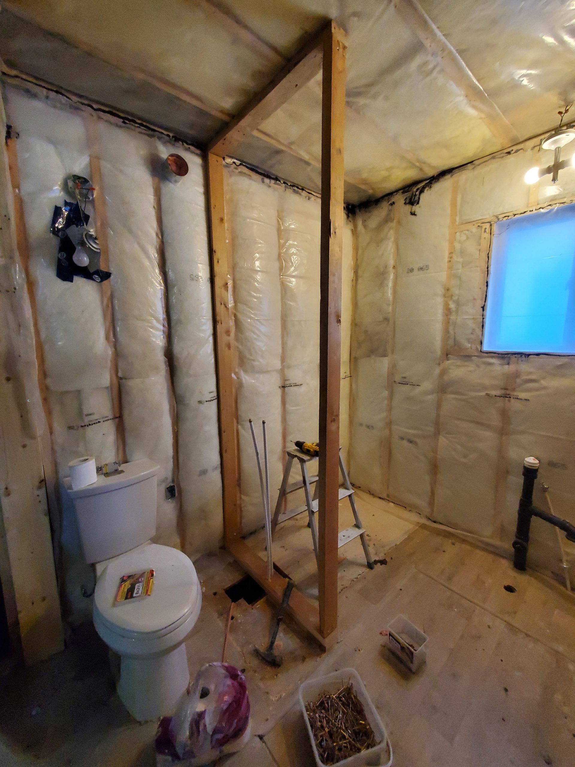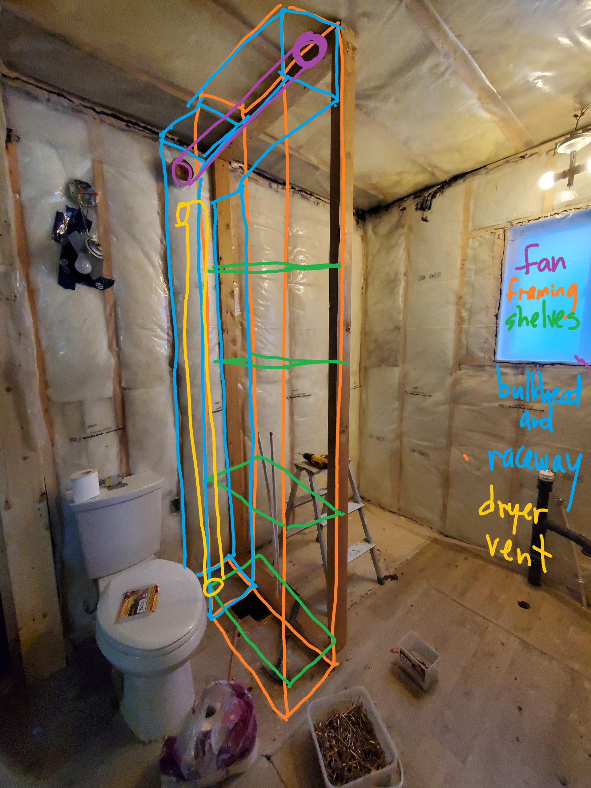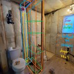 But, rather than starting those walls, I wanted to design a wall / shelf system separating the shower and toilet. It will be a 36″-long 2×4 shower wall, 4 studs, double bottom plate and shelves with 12″ 2×4 walls, a bulkhead for the bathroom fan at the top, a raceway for the dryer vent next to the wall, a 2×12 base, and four or five shelves. Sneak preview of what it will look like: